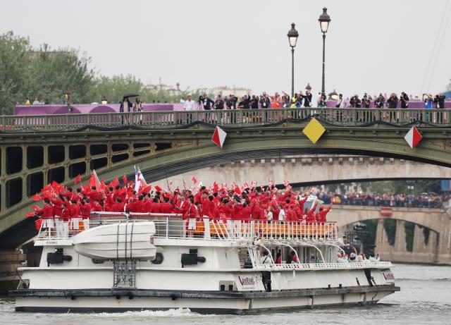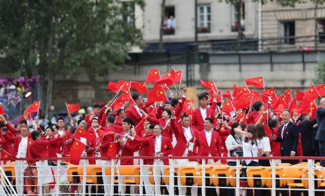 7月27日凌晨1点30分,巴黎奥运会正式拉开序幕。中国体育代表团由乒乓球运动员马龙与花样游泳运动员冯雨共同担任旗手,乘坐第16号船出场亮相。